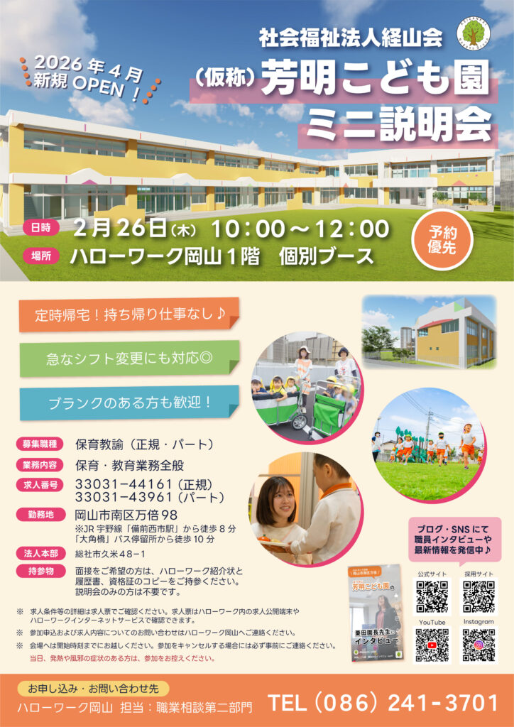 2/26(木)に、芳明こども園が「ハローワーク岡山 ミニ説明会」へ出展します!