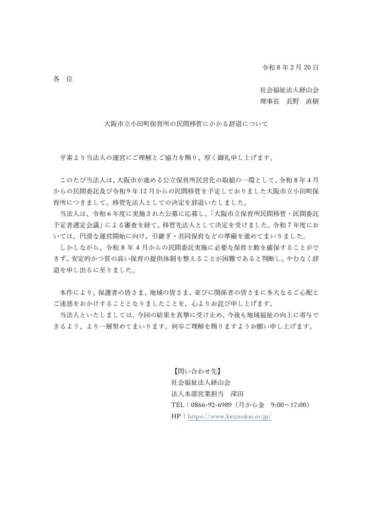 社会福祉法人 経山会の大阪市立小田町保育所の民間移管にかかる辞退について