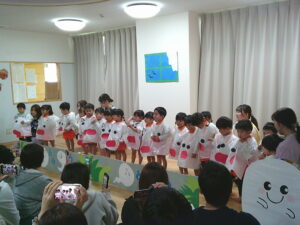 いちご組・もも組の子ども達は、ちょっぴり恥ずかしそうにしながらも、楽しく披露していました。