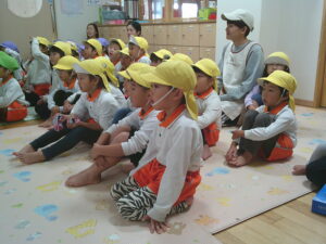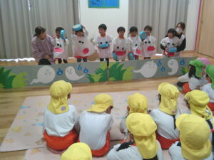 本日は、いちご・もも組の子ども達が、他のクラスのお友達を招いて…生活あそびを披露しました。