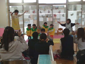 先日、さくらんぼ・いちご・もも組の発表参観日がありました。参観後、生活あそびや親子でふれあいあそびを楽しみました。子どもの成長を感じることができました。