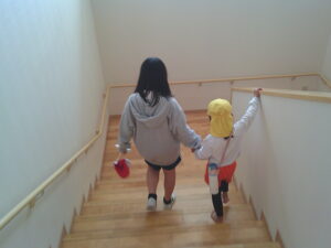 マスカット組の子ども達と手を繋いで階段をおりました。