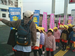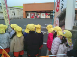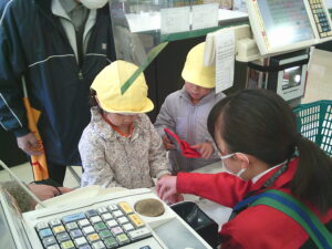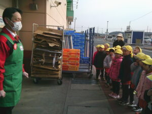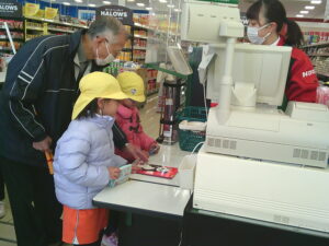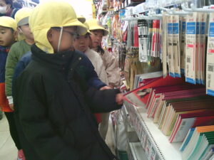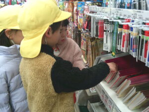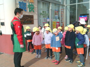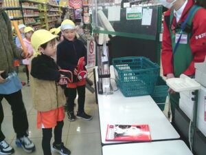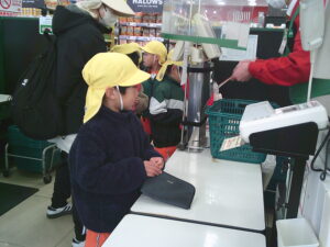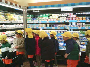 今日は、地域にあるお店の役割やそこで働く人の仕事などみたり、買い物体験をして公共のルールやマナーを学んだりしました。園周辺ということもあり、子ども達も行ったことのあるお店がたくさんありました。