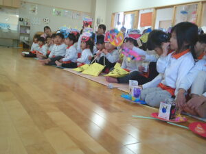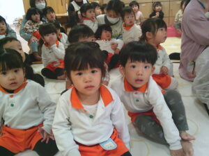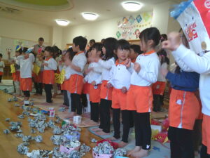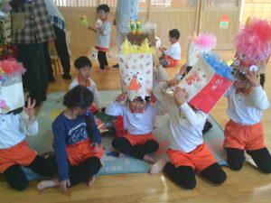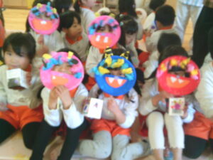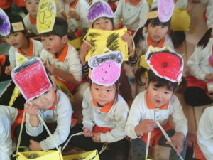 園でも…節分豆まき会をしました。子ども達は、自分で作った鬼のお面を身に付けて、参加しました。