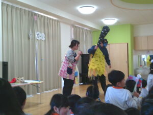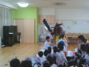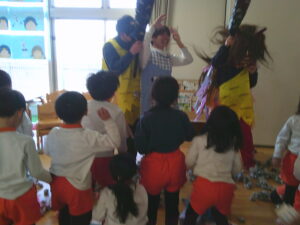 先生が鬼につれさられそうになりましたが…子ども達がやっつけてくれました。