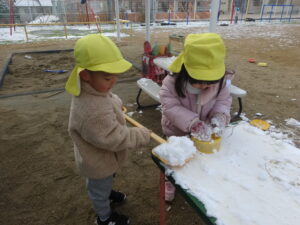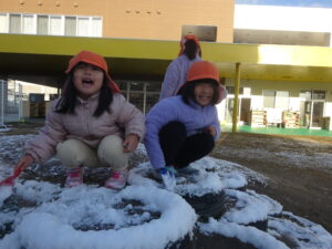 次の日の朝、園庭には少し雪が残っていました。 せっかくの雪、子どもたちが遊べるよう幼児組は登園後すぐに園庭へ。