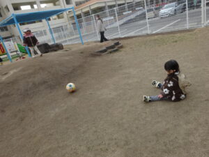 二人で相談しながらボールを転がしています。交代で山の上に行ったり下でボール受けたり。2歳児さんもこんな遊びをするんだなぁと ほっこり。