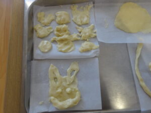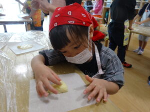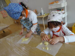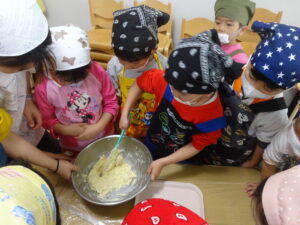 楽しみにしていたクッキングなので準備もとても早い子どもたちでした。エプロン・マスク・三角巾をつけ、手洗いも済ませ準備万端。 栄養士から作り方を聞く姿も真剣。 材料をまぜていく子どもたちに「何をまぜるの?」と問いかけると「小麦粉とバターと…」と完璧な答えが返ってきました。さすがです。