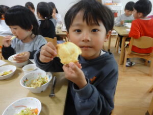 給食時間に焼きあがったクッキーです。自分で作ったクッキーは格別に美味しかったようです。