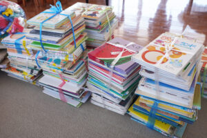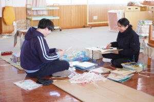 遊戯室に運び込んだ絵本やおもちゃを、対象年齢ごとに分けたり、中をチェックしたりしている様子📖