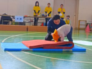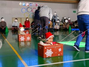 こちらは、乳児クラスの親子競技「あわてんぼうのサンタクロース♪」