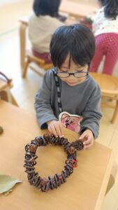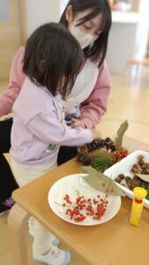 公園で拾ったり、サポーターさんにいただいたりしたどんぐりや葉っぱ、木の実等を使って飾り付けていきました。