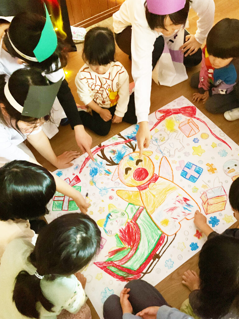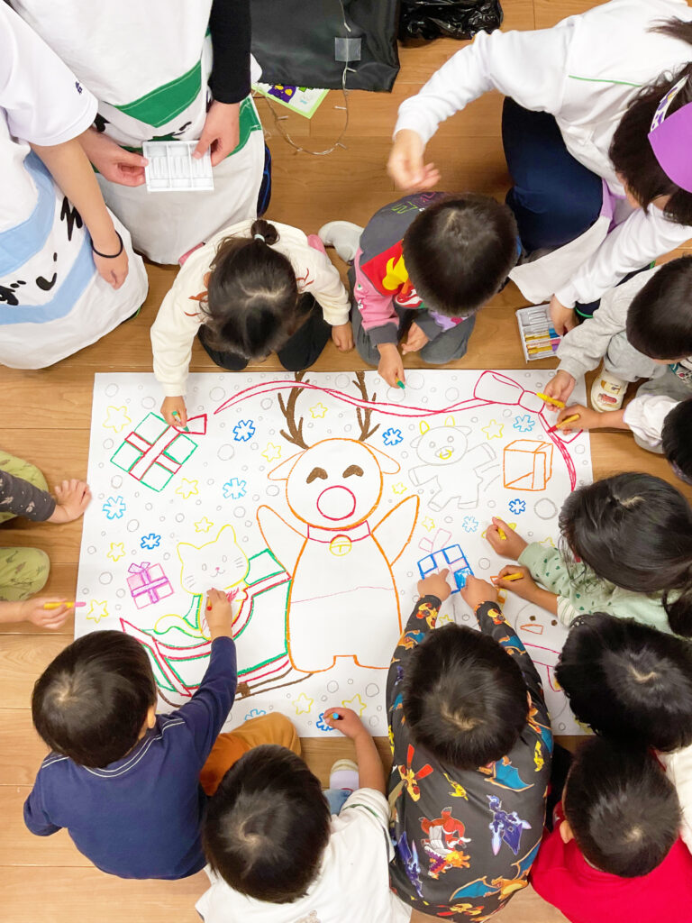 劇に出てきたクレヨンで、クリスマスの絵の色塗りをします🎅