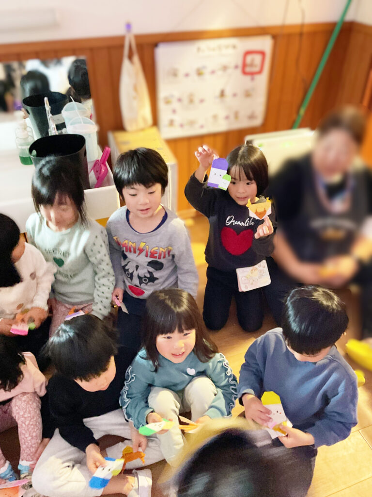 「あっ、僕、ピンク 好きだよ!」「私はみどり😊」「僕、きいろもらった✨」