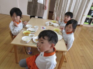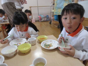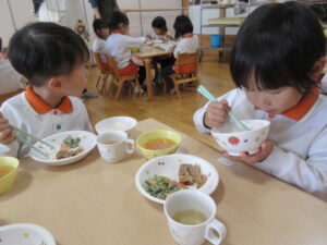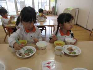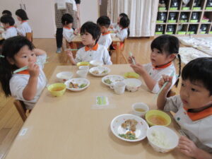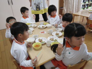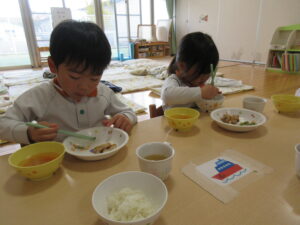 まだ難しいそうにしているお友達もいますが、頑張って箸を使って完食している子どもも多いです。