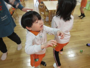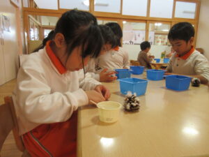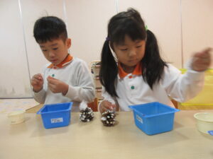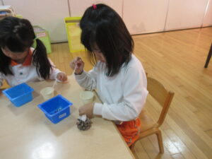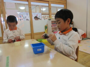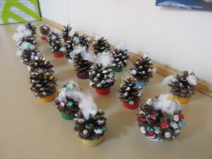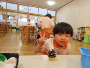 スパンコールやビーズ、綿など好きな材料を選んで松ぼっくりに飾り付けました🎵