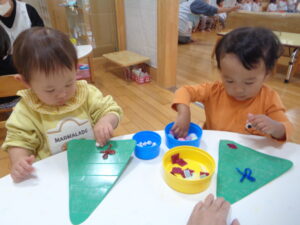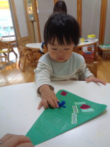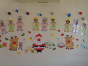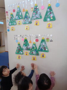 廊下を歩いていると・・・クリスマスツリーや他のクラスの製作を見て
