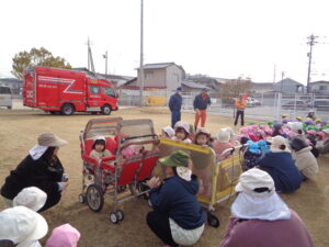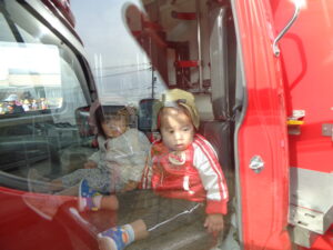 避難訓練では、消防車を近くで見ました。