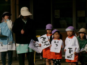 各家庭から持ってきたお飾りと一緒にみんなの書いた掛け初めやぬり絵を園長先生が燃やしてくれました。