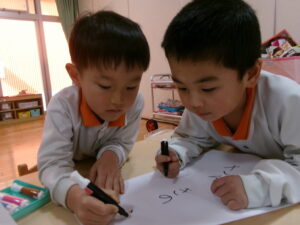 「なんてかくー?」「おわかれかいに きてください!」