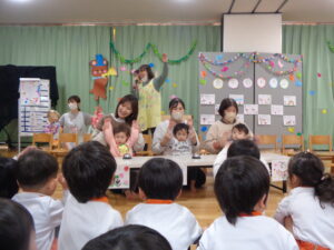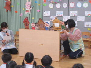 二つ目はマスカット組さんがみかん組さんの時、発表会でした「3匹のこぶた」のペープサートをみました🐽💕
