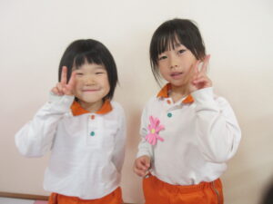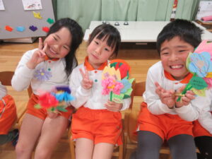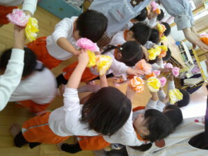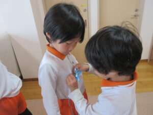 メロン組さんが手作りしたコサージュをマスカット組さんに付けてあげましたよ☺️🎉