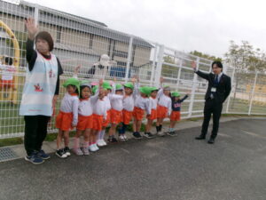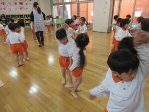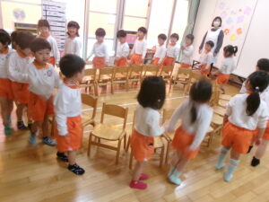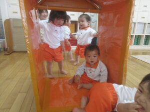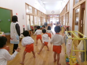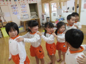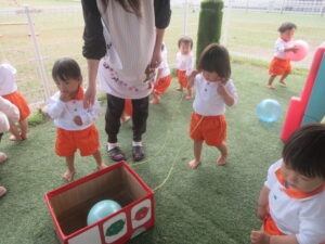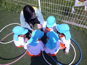 メロン組さんとの集団遊びではマスカット組さんがリードして遊びを教えてあげて