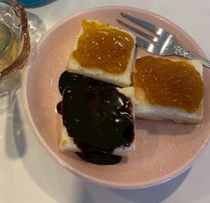 チョコソースと、手作りの梅ジャムをのせて