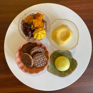 かぼちゃのグラッセ、かぼちゃクリーム、あんこ、ワッフル、いちじくゼリーなど