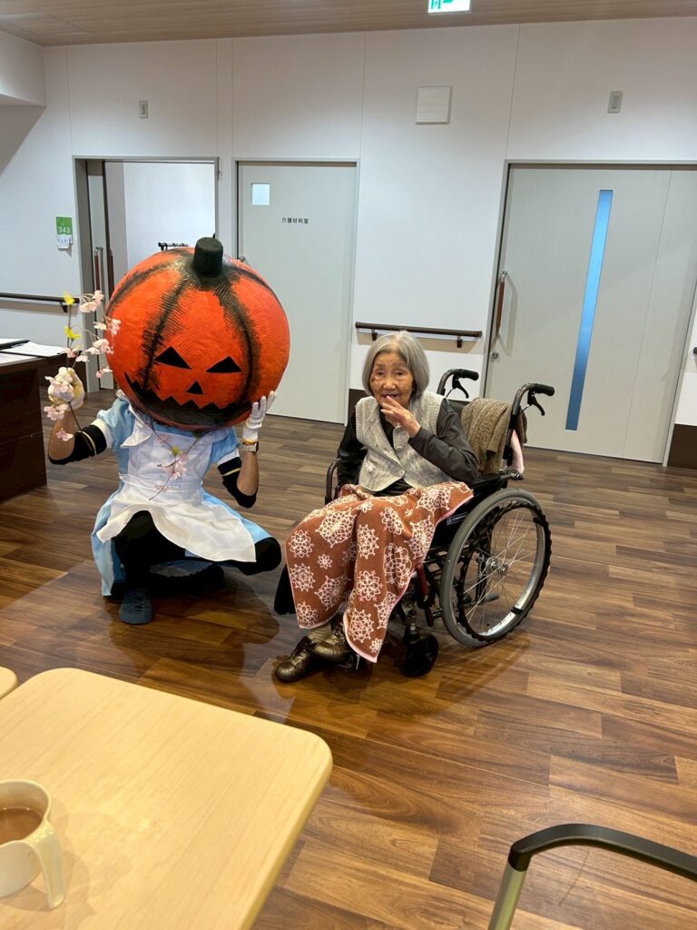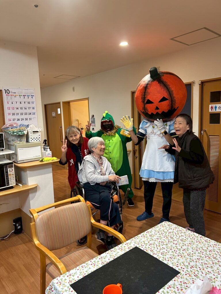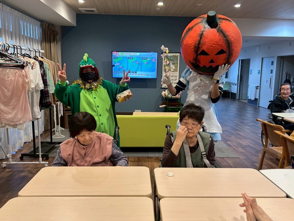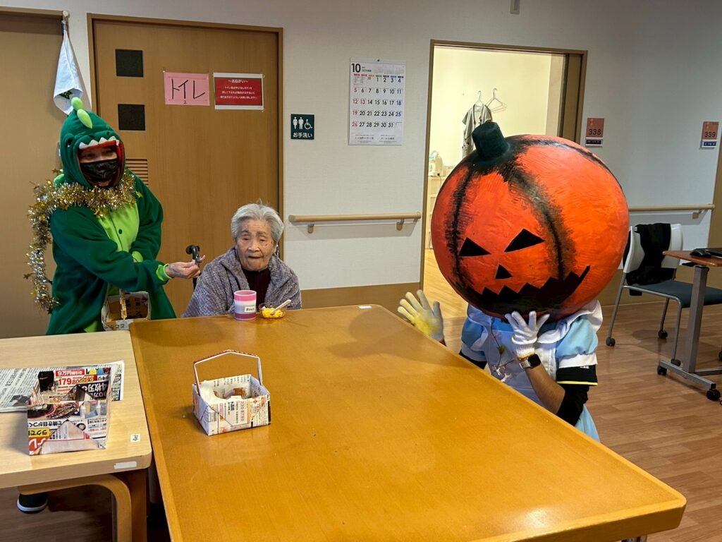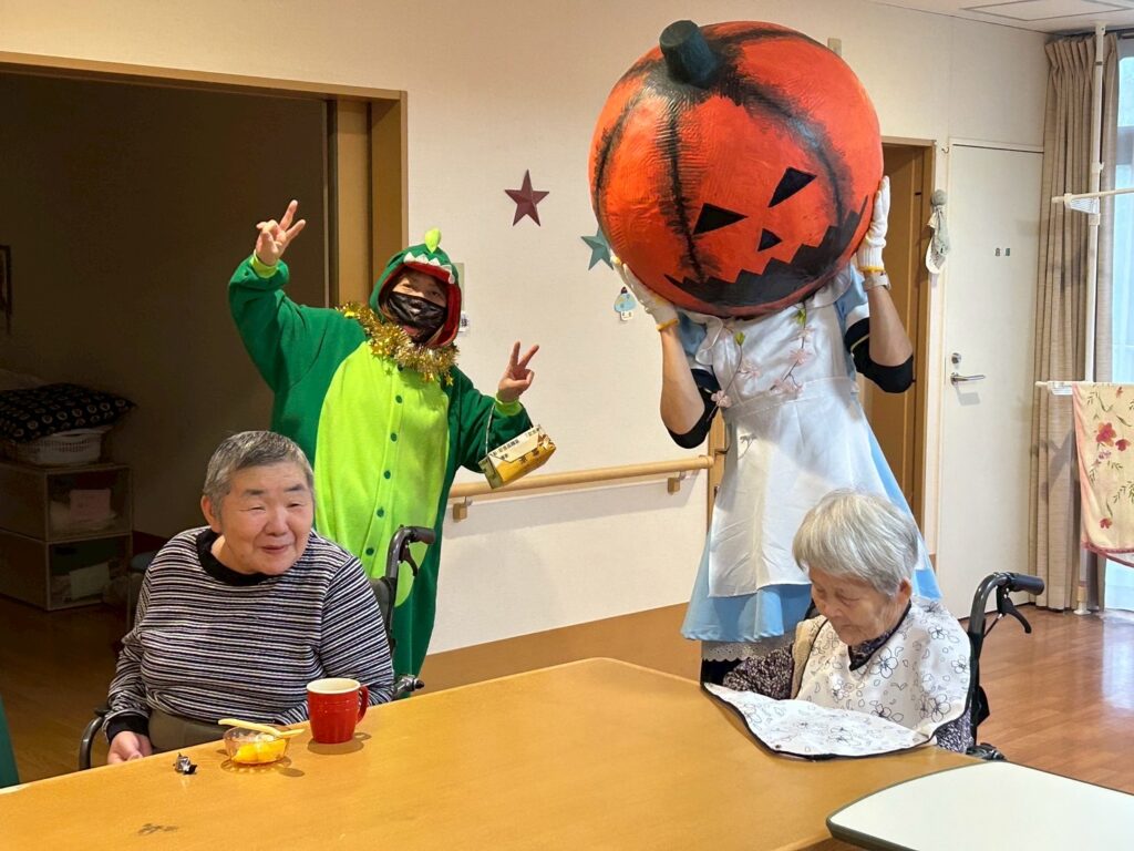 大きなカボチャのお化けと、小さな小さな恐竜が、施設内を練り歩いてご利用者様を驚かせておりました!