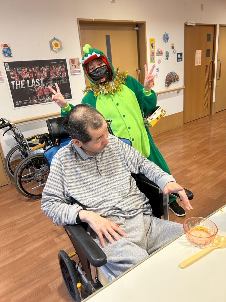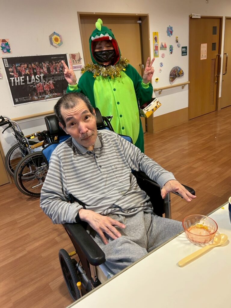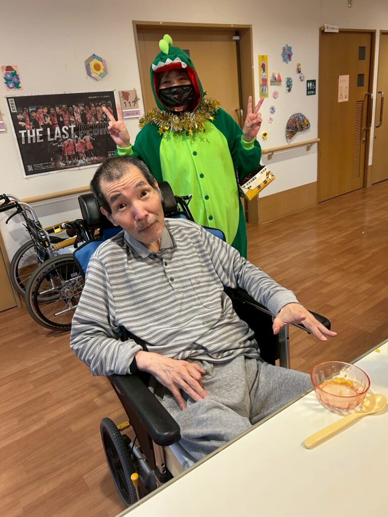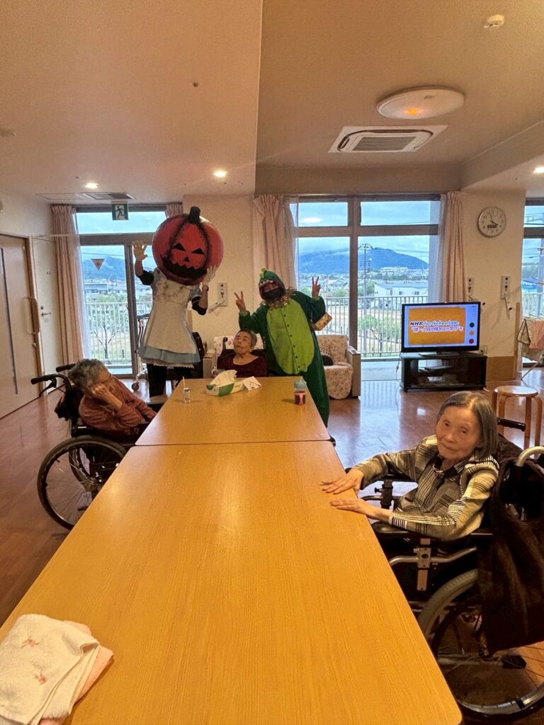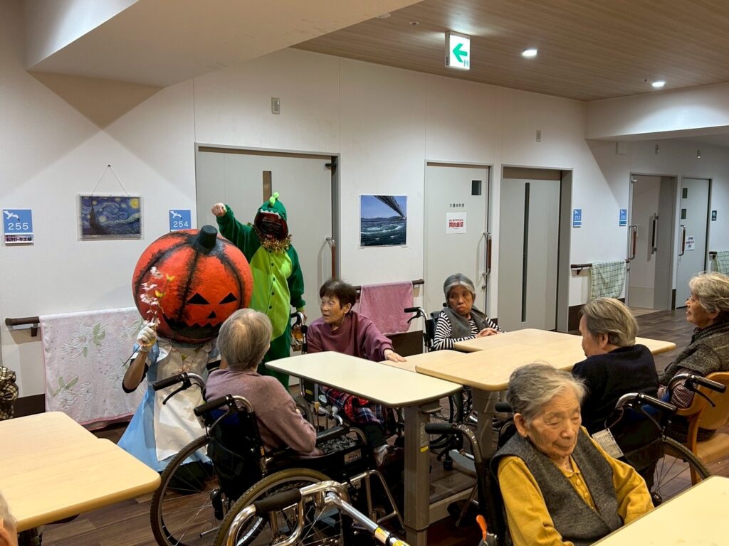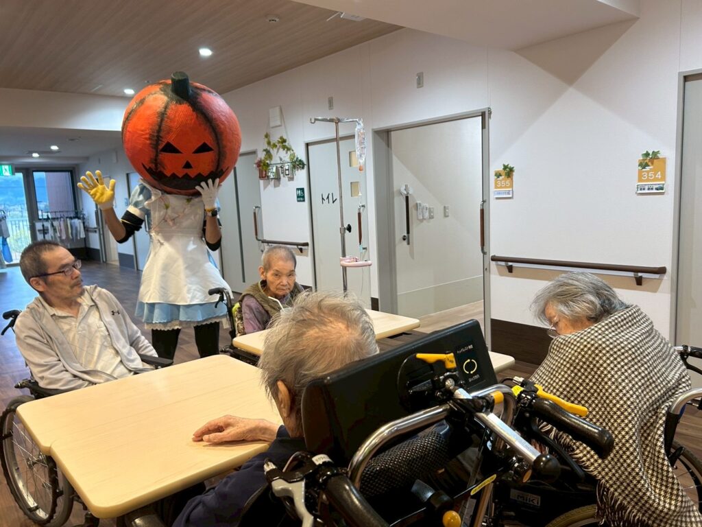 大きなカボチャのお化けと、小さな小さな恐竜が、施設内を練り歩いてご利用者様を驚かせておりました!