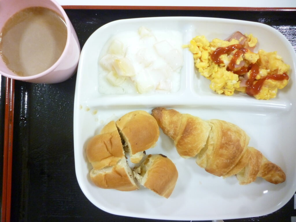 クロワッサン、レーズンロール、ベーコンエッグ、フルーツヨーグルトです