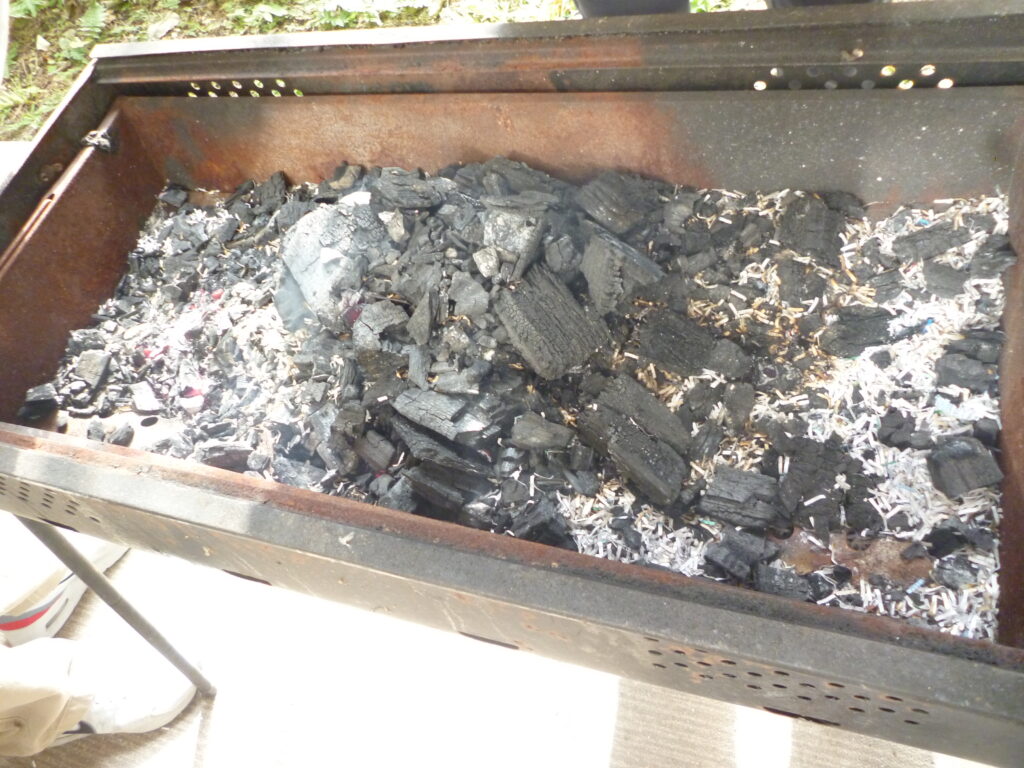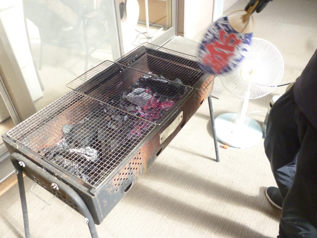 屈強な男性職員に炭から火をおこしてもらい