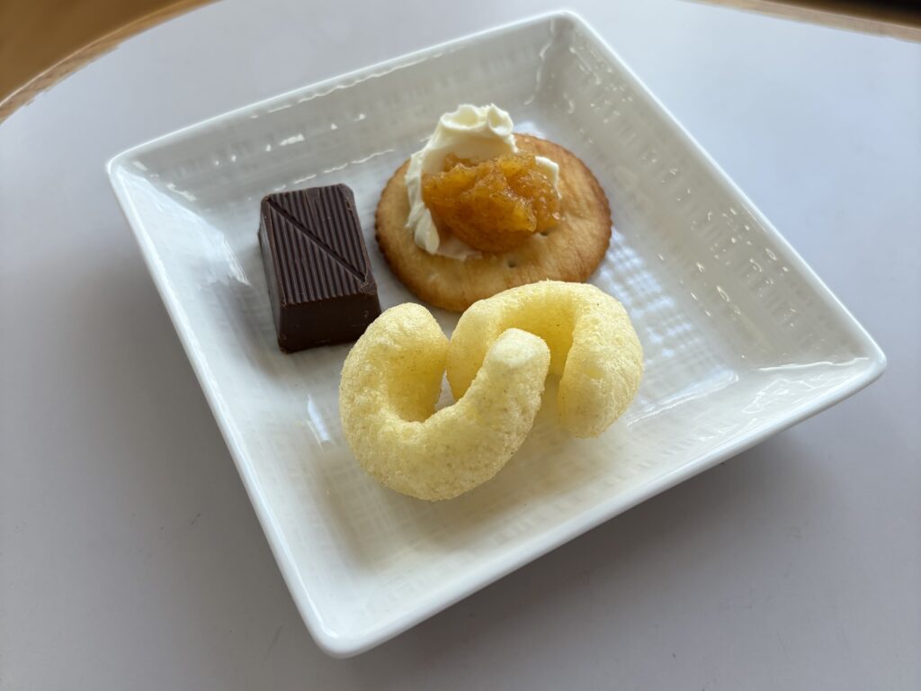 栄養士手作りのおつまみは、「柿とクリームチーズのカナッペにチョコやスナック菓子を添えて」ですよ。お飲み物は、さまざまな(ノン)アルコールを、取り揃えました!