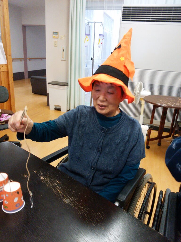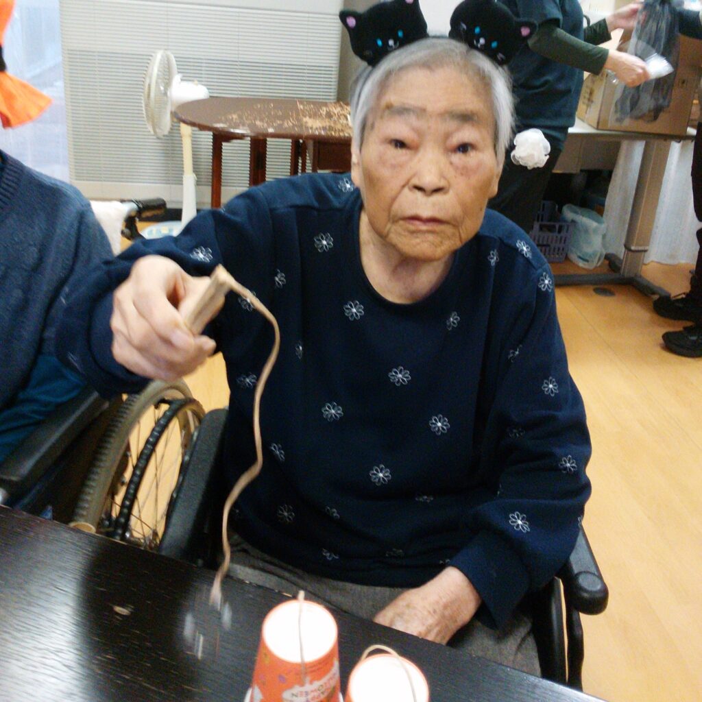 皆さんで仮装して、紙コップ釣りゲームをして楽しみました。