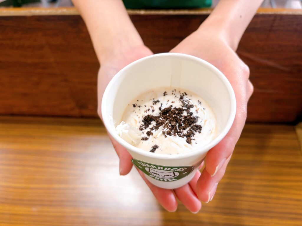 の2種類をご準備!どちらも上に生クリームをのせて、それぞれオレオクッキーといちごビスケットをトッピングしています🍪🍓