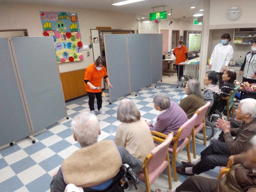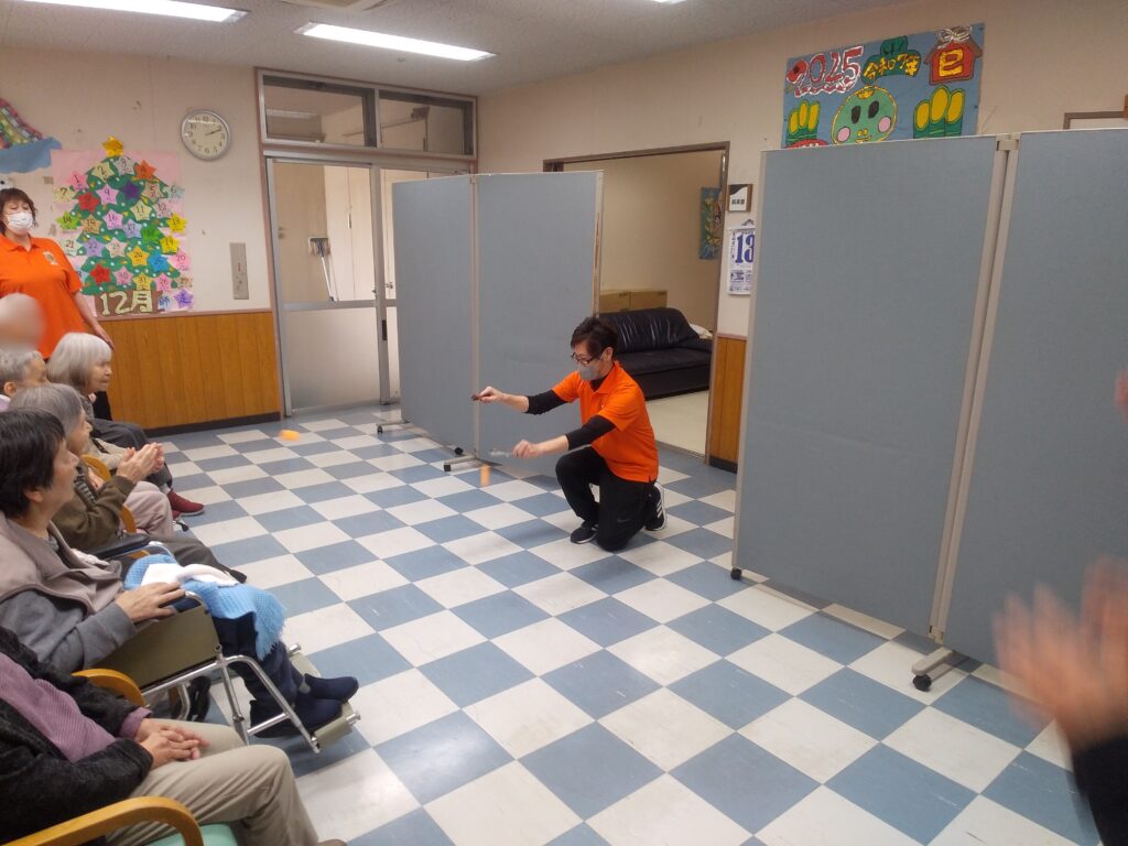 次は職員チャレンジ!「ピンボールキャッチ」と「1円玉立て」です!さぁ誰が上手にできるかな??