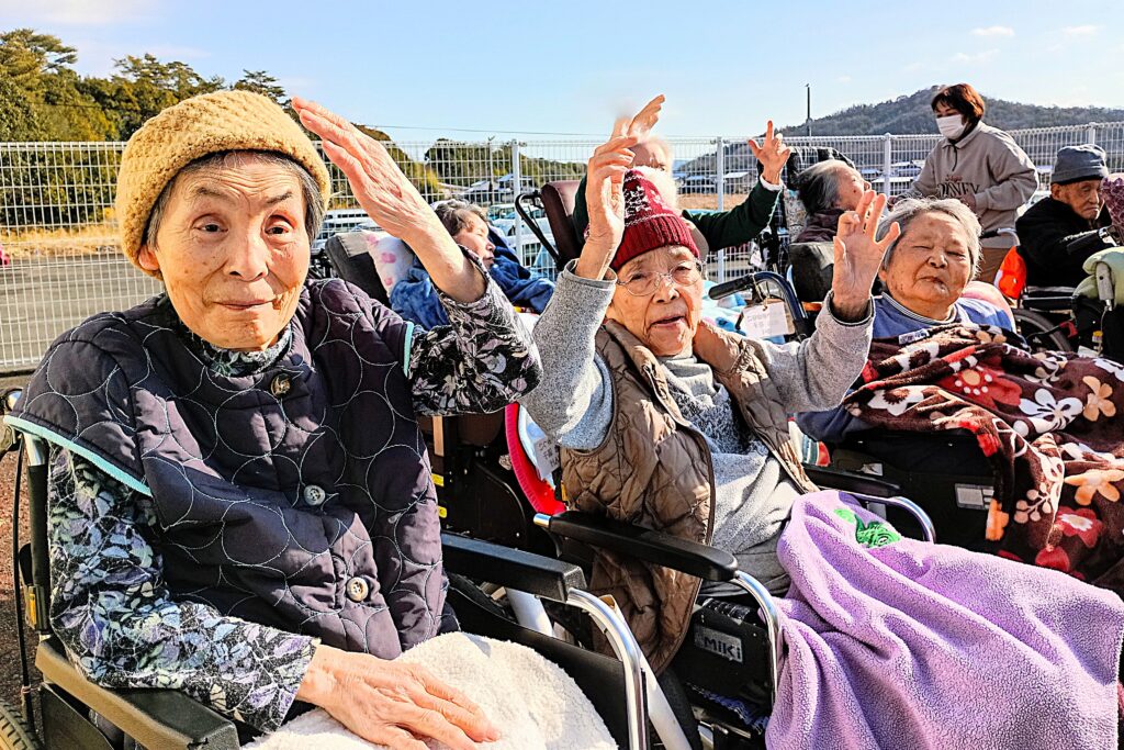 みんさんに駐車場側の広場に集まっていただきました。