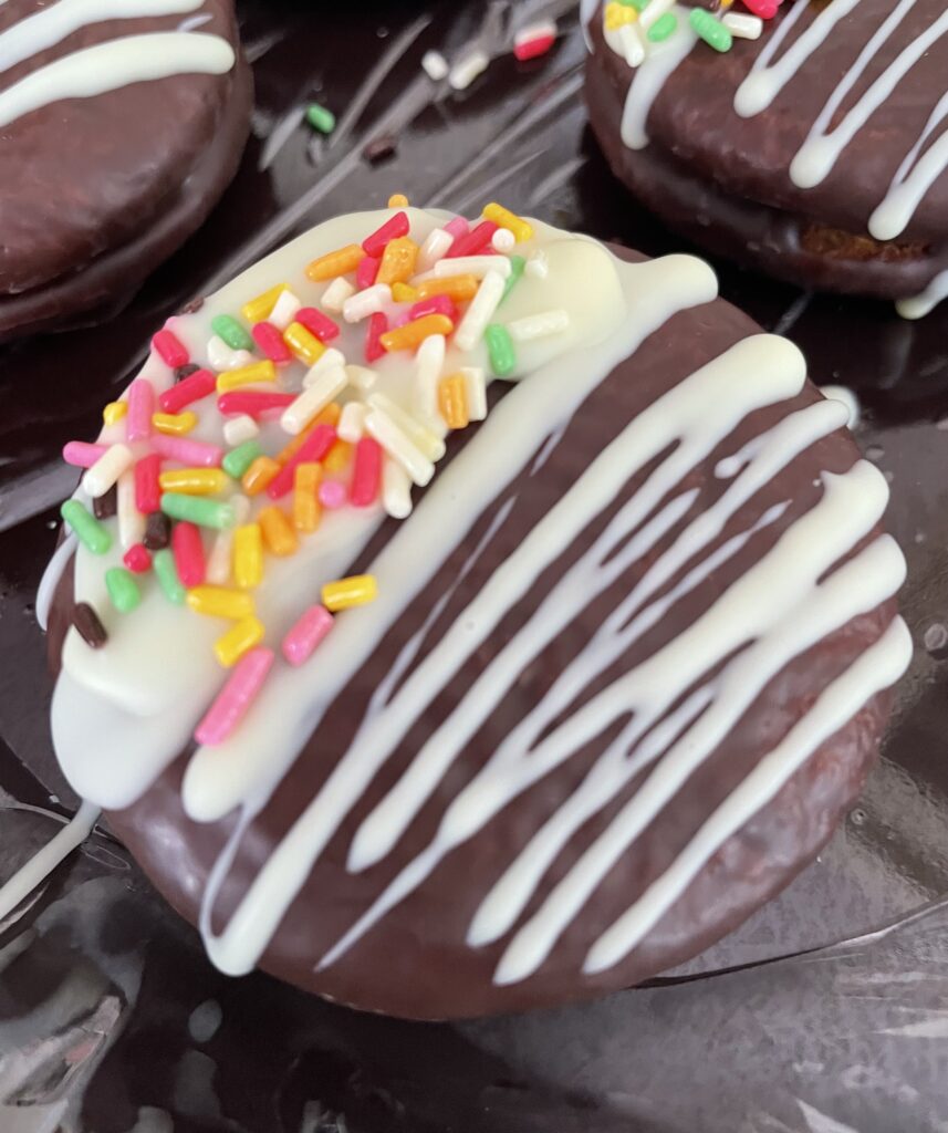 市販のチョコパイに、ホワイトチョコとカラースプレーでかわいくアレンジしました(≧▽≦)