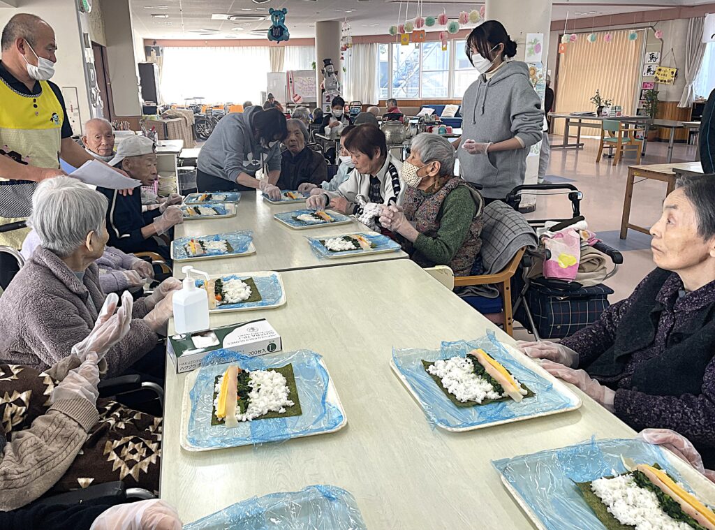 特養1Fでは、恵方巻きを作ったり、豆に見立てた新聞紙ボールで豆まきをしたりしました。