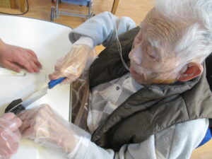 そして最後に完成した巻き寿司のカット作業を入居者のみなさんにお手伝いいただき
